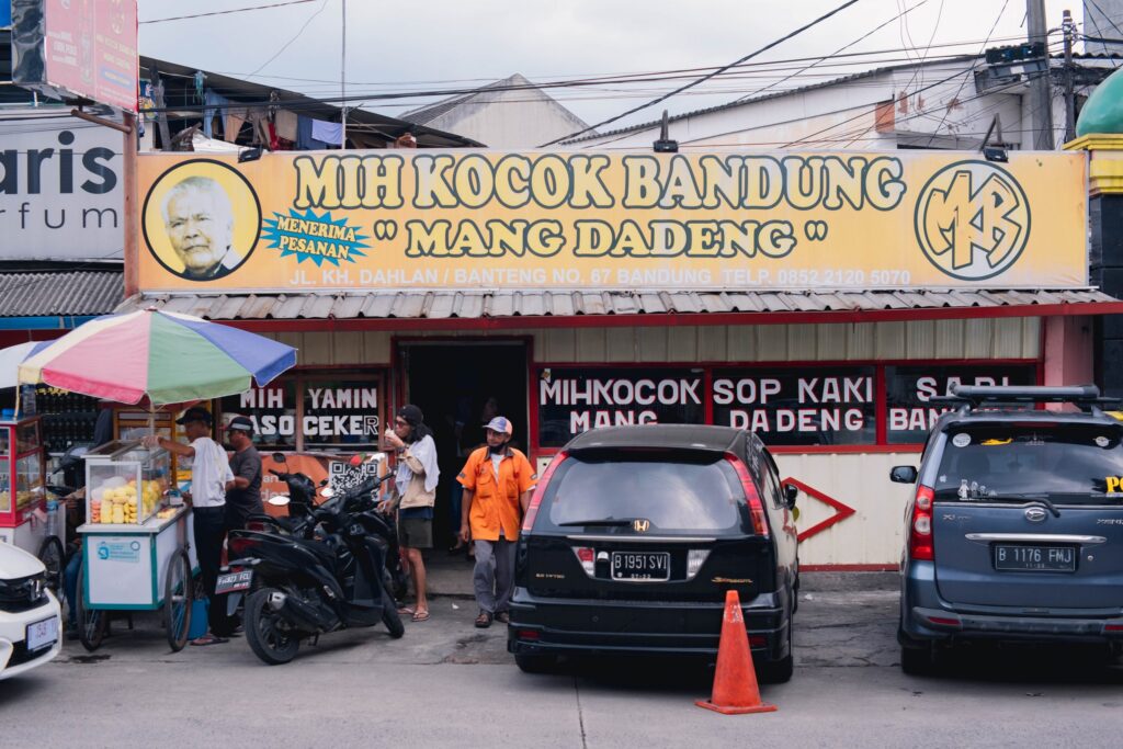 Terletak di Jalan Banteng, Mie Kocok Mang Dadeng sudah menjadi ikon kuliner Kota Kembang sejak tahun 1960-an. Saat Anda memasuki warung sederhana ini, aroma kaldu sapi yang gurih langsung menyambut. Suasana riuh pembeli yang antre, suara dentingan sendok, dan asap yang mengepul dari panci air panas menambah kehangatan.